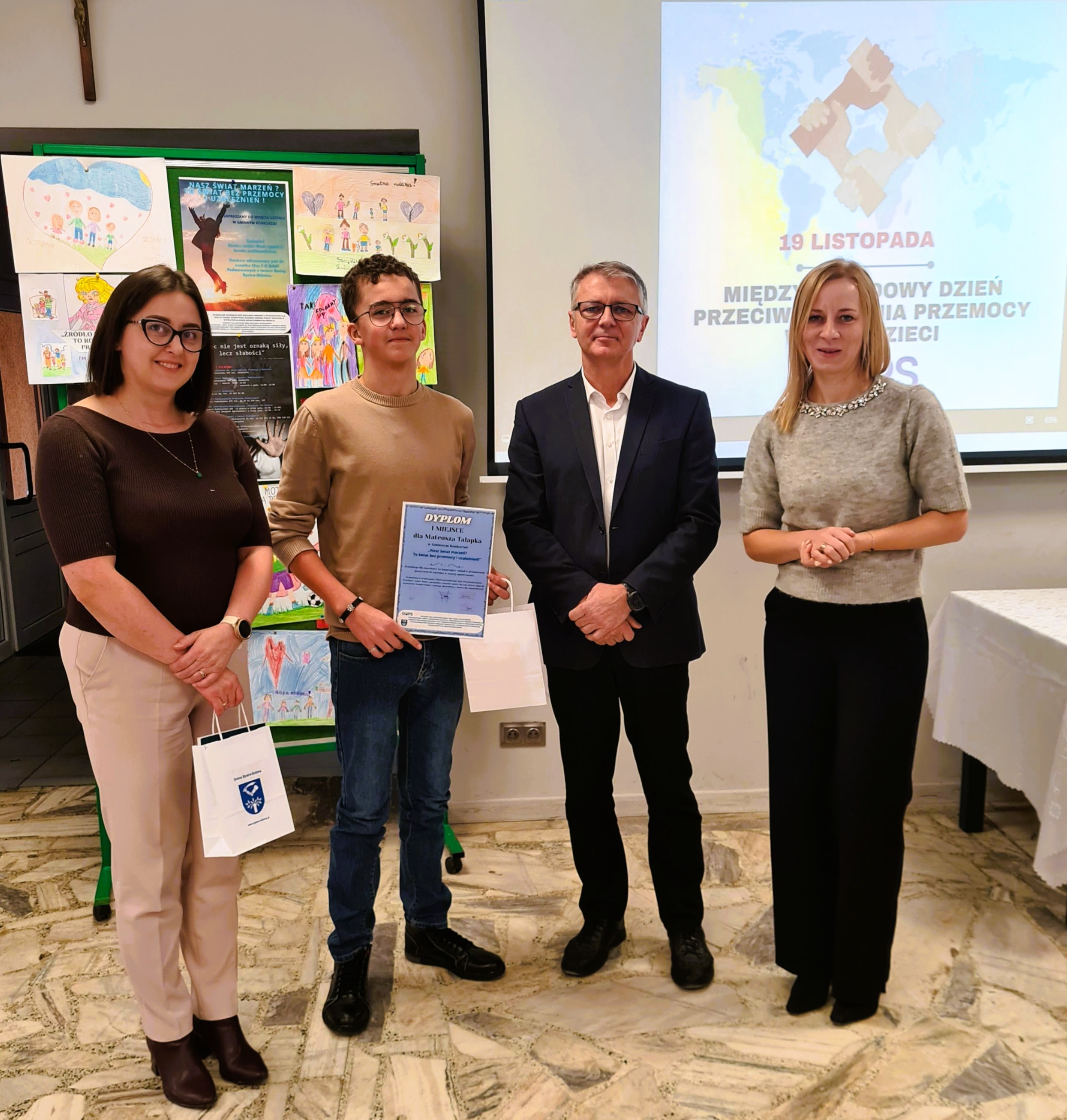 Uroczyste rozstrzygnięcie konkursu odbyło się 19 listopada w siedzibie Gminy Bystra-Sidzina. Prócz uczestników konkursu i ich opiekunów, w prezentacji nagrodzonych filmów wzięli udział: wójt Gminy Bystra-Sidzina pan Stanisław Tempka, dyrektor Szkoły Podstawowej im. Dzieci Zamojszczyzny w Sidzinie, pan Mieczysław Matyasik, dyrektor Szkoły Podstawowej im. św. Jana Kantego w Bystrej Podhalańskiej pan Marek Drobny, pedagog szkolny pani Patrycja Blacha, dzielnicowy Sidziny sierż. szt. Maciej Bubak, kierownik Gminnego Ośrodka Pomocy Społecznej w Bystrej Podhalańskiej pani Jadwiga Siepak, przewodnicząca Zespołu Interdyscyplinarnego do spraw Przeciwdziałania Przemocy w Rodzinie pani Maria Banadyk oraz pracownik socjalny pani Agnieszka Trybuła.