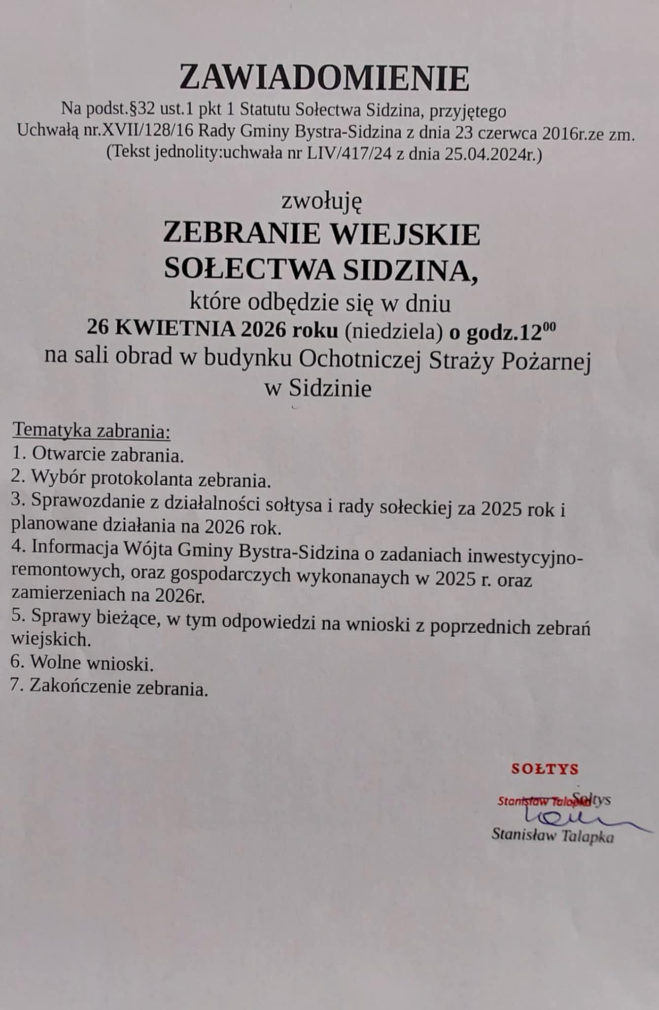 Zebranie Wiejskie sołectwa Sidzina